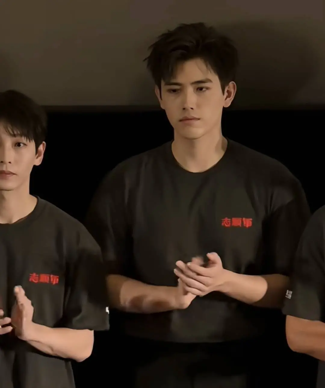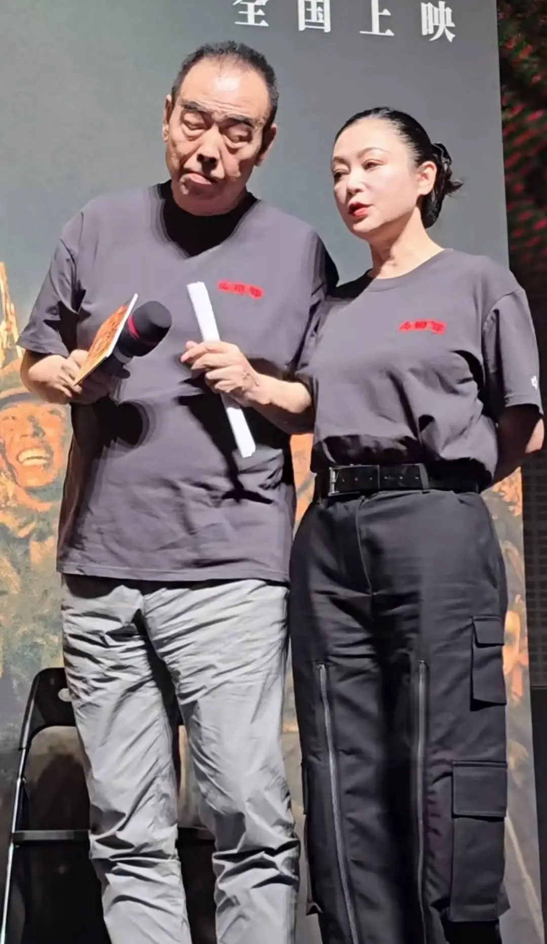 当天,陈红与陈凯歌身穿电影宣传T恤亮相,但夫妻俩并未与儿子陈飞宇一同站立。陈飞宇则与其他演员聚在一旁,神情严肃,状态紧绷,看来父母的在场并未让他感到轻松。